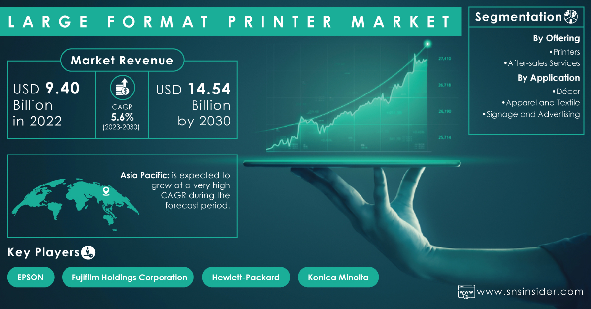 AUSTIN, TEXAS, UNITED STATES, April 9, 2024 /EINPresswire.com/ -- Market Analysis & Report Scope:The SNS Insider report reveals that the Large Format Printer Market Size reached USD 9.40 billion in 2022 and is projected to achieve USD 14.54 billion by 2030, growing at a CAGR of 5.6% during the forecast period from 2023 to 2030.