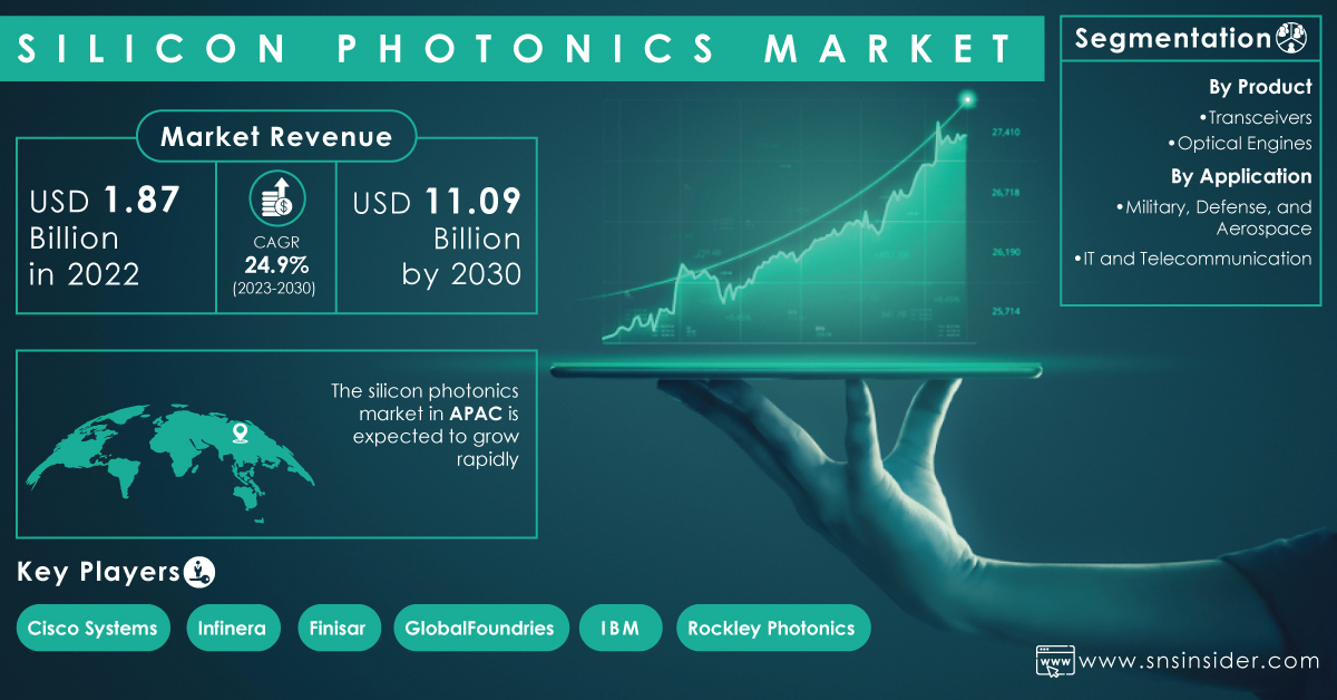 AUSTIN, TEXAS, UNITED STATES, April 9, 2024 /EINPresswire.com/ -- Market AnalysisThe Silicon Photonics Market Size, as per the SNS Insider report, stood at USD 1.87 billion in 2022, projected to reach USD 11.09 billion by 2030, with a CAGR of 24.9% during 2023-2030.