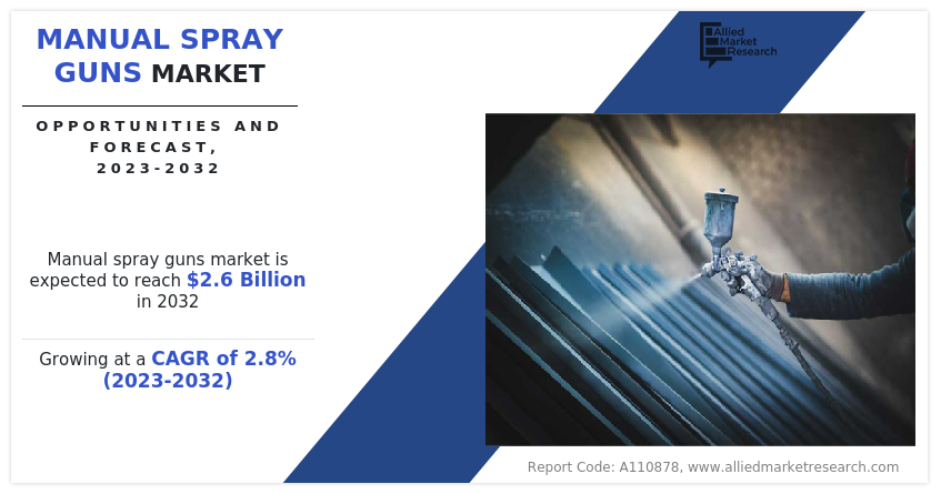 WILMINGTON, DELAWARE, UNITED STATES, April 11, 2024 /EINPresswire.com/ -- Manual Spray Gun Market by Type (Airless Spray Gun, HVLP, and LVLP), Material (Paint, Coating, Fire protection, and Other), Power Source (Pneumatic, Electric, and Gas powered), End-user Industry (Automotive, Woodworking, Marine, Steel, Construction, Manufacturing, and Others) and Sales Type (Dealers/Distributors, DIY, and Professionals): Global Opportunity Analysis and Industry Forecast, 2022–2032." According to the report, the global manual spray guns market was valued at $1.8 billion in 2020, and is projected to reach $2.6 billion by 2032, registering a CAGR of 2.8% from 2023 to 2032.