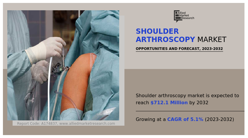 PORTLAND, OREGON, UNITED STATES, April 11, 2024 /EINPresswire.com/ -- Allied Market Research published a report, titled, “Shoulder Arthroscopy Market by Product Type (Arthroscopes, Power Shaver Systems, Shoulder Arthroscopic Implants, Arthroscopic Systems, and Others), Indication (Rotator Cuff Tears, Shoulder Instability or Dislocation, Frozen Shoulder, Shoulder Impingement Syndrome, and Others), and End User (Hospitals, Ambulatory Surgical Centers, Other): Global Opportunity Analysis and Industry Forecast, 2023-2032″. The shoulder arthroscopy market was valued at $432.46 million in 2022 and is estimated to reach $712.12 million by 2032, exhibiting a CAGR of 5.1% from 2023 to 2032.