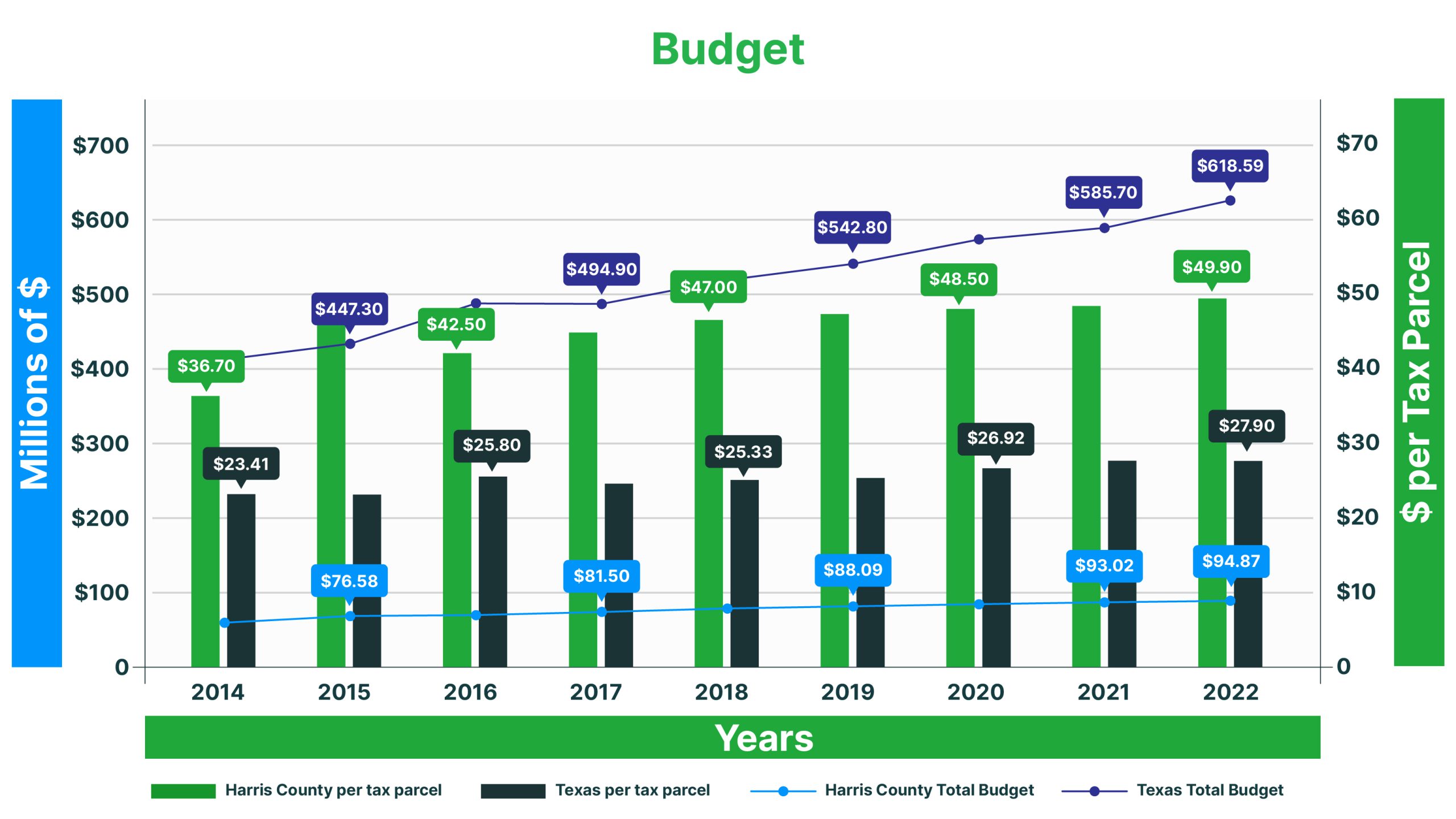 HOUSTON, TEXAS , UNITED STATES, April 12, 2024 /EINPresswire.com/ -- The 2022 budget for the Harris Central appraisal district (HCAD) amounted to $94.87 million, while the budget for the Harris County appraisal review board (ARB) portion was $3.58 million. HCAD’s budget translates to approximately $49 per tax parcel, based on the 1,902,200 tax parcels in 2021. Notably, HCAD’s budget is 85% higher than the statewide average of $27 for 2022. The collective budget for appraisal districts across Texas in 2022 was $618 million.Appraisal district Budgets