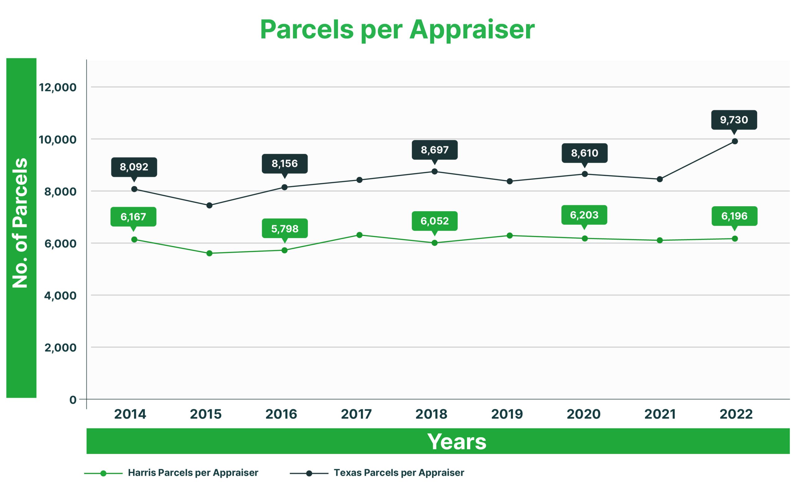 In the Harris Central Appraisal District, there is one appraiser employed for every 6,196 accounts, compared to 9,730 statewide.
