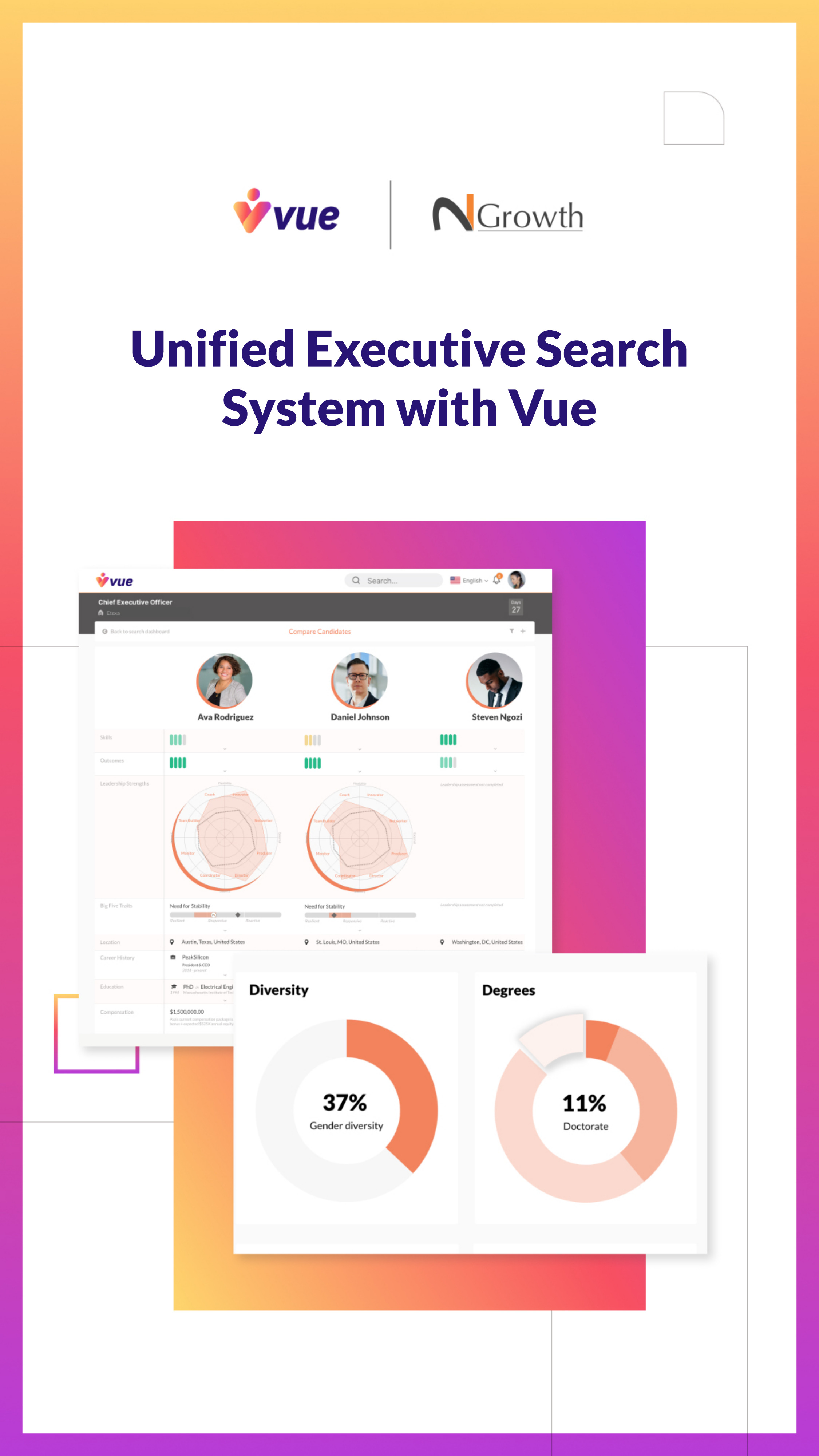 KING OF PRUSSIA, PA, UNITED STATES, April 12, 2024 /EINPresswire.com/ -- Executive recruiting has become a complex challenge. Traditional methods no longer suffice, and recruitment's rapid evolution demands a new approach. N2Growth, a global executive search and leadership advisory leader, is challenging the status quo and driving innovation by unveiling Vue, a new cutting-edge, proprietary technology driving real change in the industry.Vue was developed in response to three significant search industry challenges: a lack of access and transparency, an absence of whole-person evaluations, and insufficient use of diversity, equity, and inclusion criteria in the hiring process.