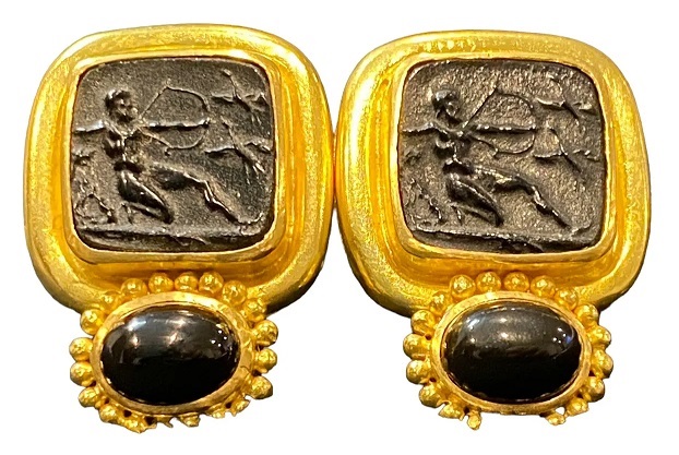Lots 30 and 31 are rare collectibles by Elizabeth Locke. The necklace is an impressive 19k gold Intaglio Pendant on Black Onyx Bead Necklace and the matching earrings are also 19k gold, both signature pieces by the artist.