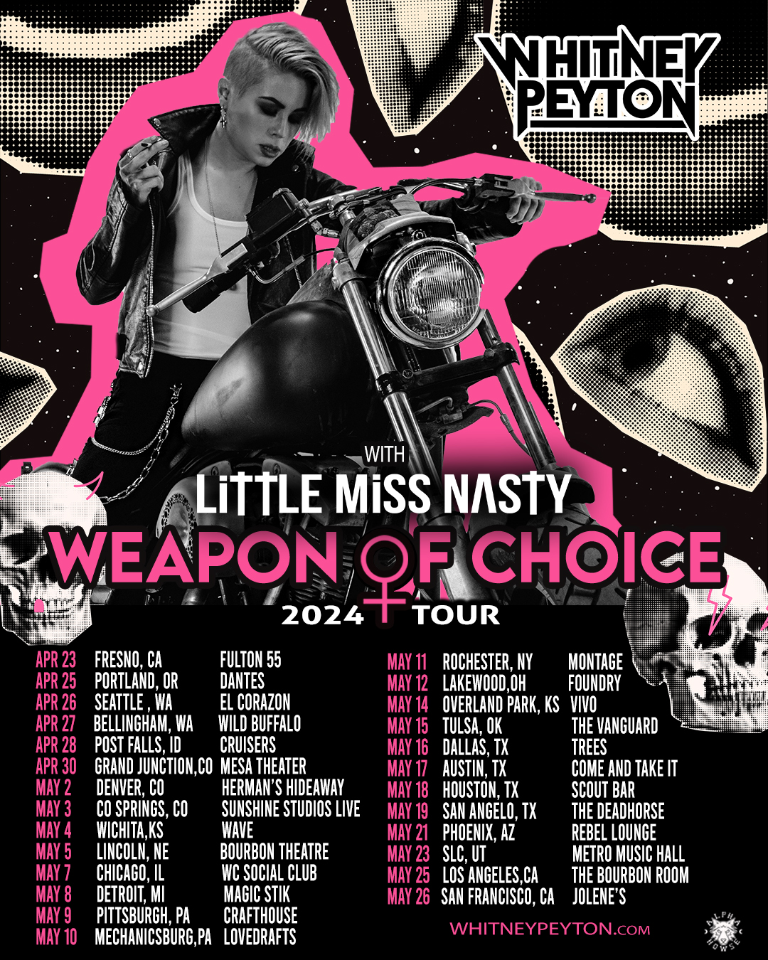 As if all of that wasn’t enough, this news comes directly on the heels of Whitney Peyton releasing several new singles, as well as announcing an extensive nationwide tour with popular Rock Burlesque group, Little Miss Nasty. The unlikely combination of these wild women promises an unforgettable experience blending music with interactive and unapologetic performances. The 2024 Tour entitled 'Weapon of Choice' kicks off April 23rd and makes its way around the country, so don’t miss out when it hits a city near you!