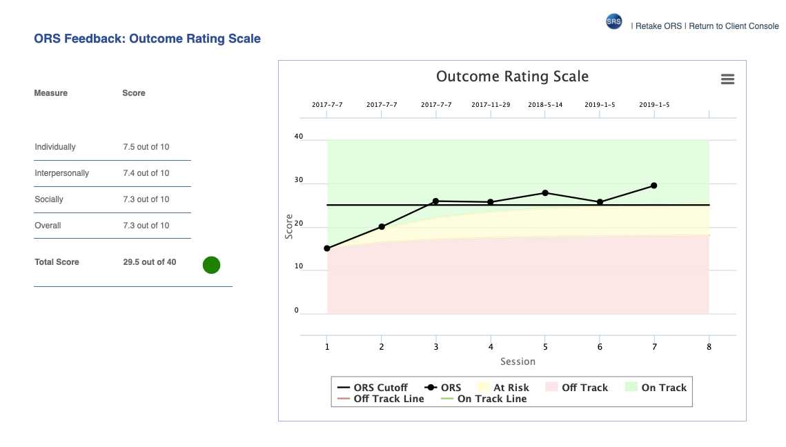 The ORS, a brief visual analog measure (just 4 questions–which takes less than a minute to complete), is designed to quickly gauge a client's perceived progress across various domains of their life, including individual well-being, interpersonal relationships, social role and overall mental health. The simplicity and immediacy of ORS allow for real-time feedback, facilitating adjustments in therapy that are closely aligned with the client's current needs and perspectives.