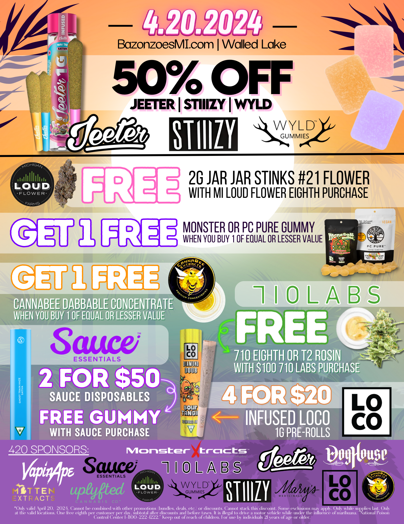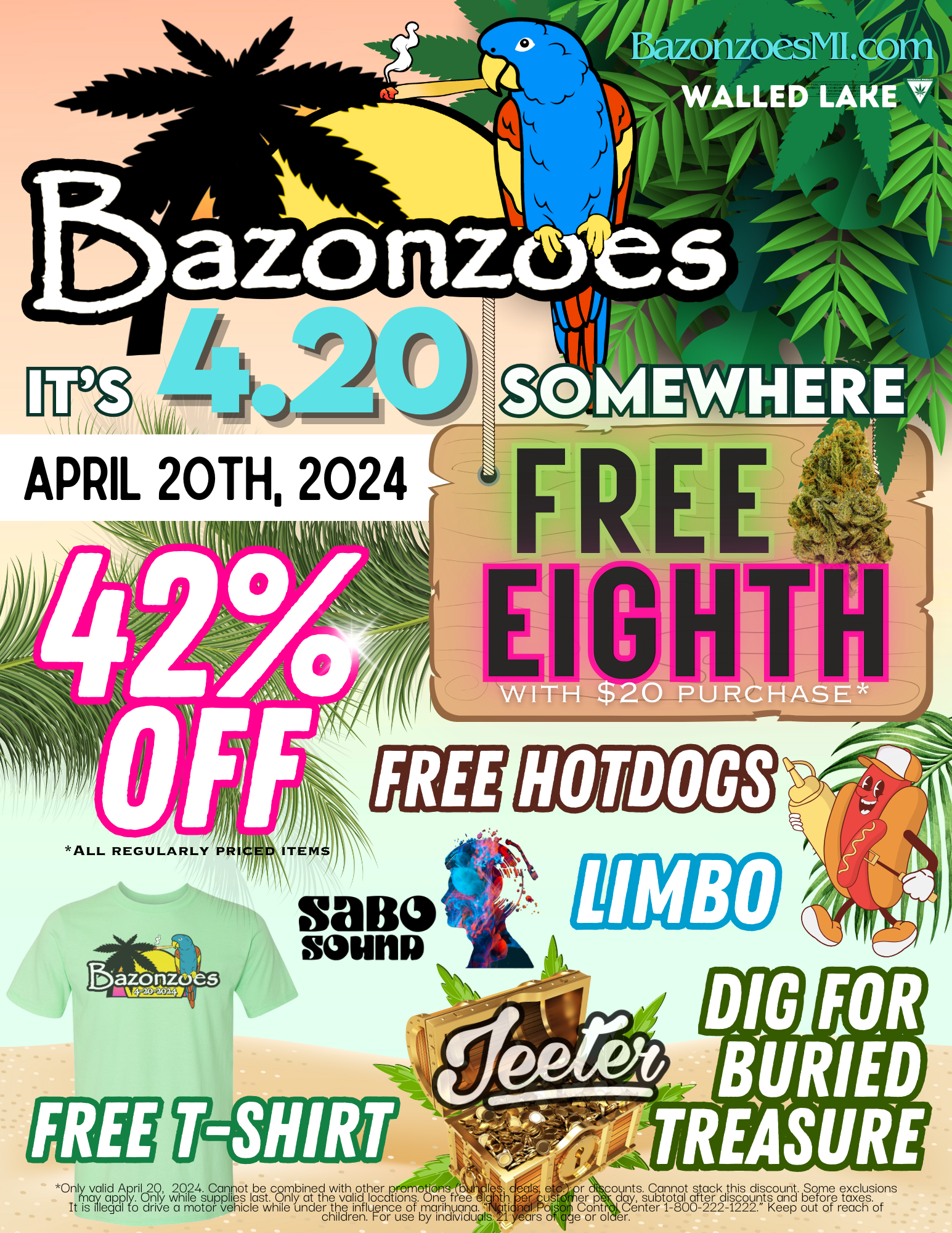 Bazonzoes Walled Lake is open from 9am-9pm on 4/20 and Lansing is open from 10am-9pm. Details about individual store offers will be available on the website.