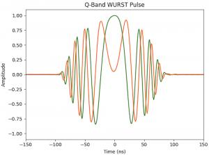 An example of the type of AWG generated pulses used in a modern EPR experiment is shown in figure 2. WURST (Wideband, Uniform Rate, Smooth Truncation) pulses are broadband microwave pulses with an excitation bandwidth and profile that exceeds that of a simple rectangular pulse by far. Pulses like this allow for broadband excitation in EPR spectroscopy and heavily rely on the performance of the AWG.