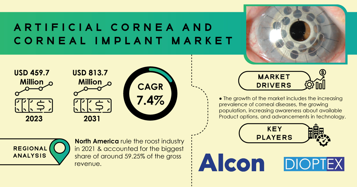 AUSTIN, TEXAS, UNITED STATES, April 16, 2024 /EINPresswire.com/ -- According to SNS Insider, The Artificial Cornea and Corneal Implant Market valued at USD 459.7 Million in 2023, is projected to attain USD 813.7 Million by 2031, registering a steady CAGR of 7.4% during the forecast period from 2024 to 2031. While corneal transplants remain the mainstay of treatment, limitations exist. The supply of donor corneas is often insufficient to meet the rising demand, particularly in developing regions. Additionally, factors like tissue rejection and logistical challenges associated with donor procurement pose hurdles. This creates a significant opportunity for artificial corneas to bridge the gap.Challenges: