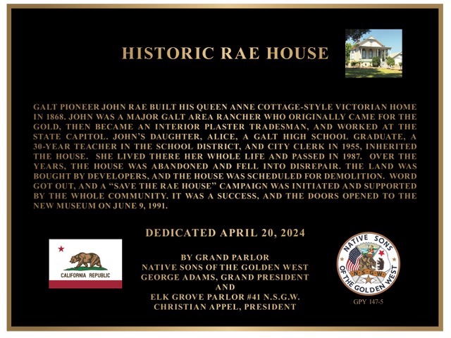 GALT, CALIFORNIA, UNITED STATES, April 17, 2024 /EINPresswire.com/ -- The Native Sons of the Golden West, Elk Grove Parlor #41, is proud to announce the dedication of the Historic Rae House, a Queen Anne Cottage-style Victorian home significant to the City of Galt's heritage. The ceremony will be held on Saturday, April 20, 2024, at 1 p.m. at 204 Oak Avenue, Galt.Constructed in 1863 by pioneer John Rae, the Rae House is a testament to the City of Galt’s rich history. John Rae, an influential figure and Galt area rancher, left a legacy through his home’s architecture and his family’s contribution to the community. His daughter Alice Rae, a dedicated educator and Galt High School graduate lived in the house until 1985 and served as City Clerk in 1955.