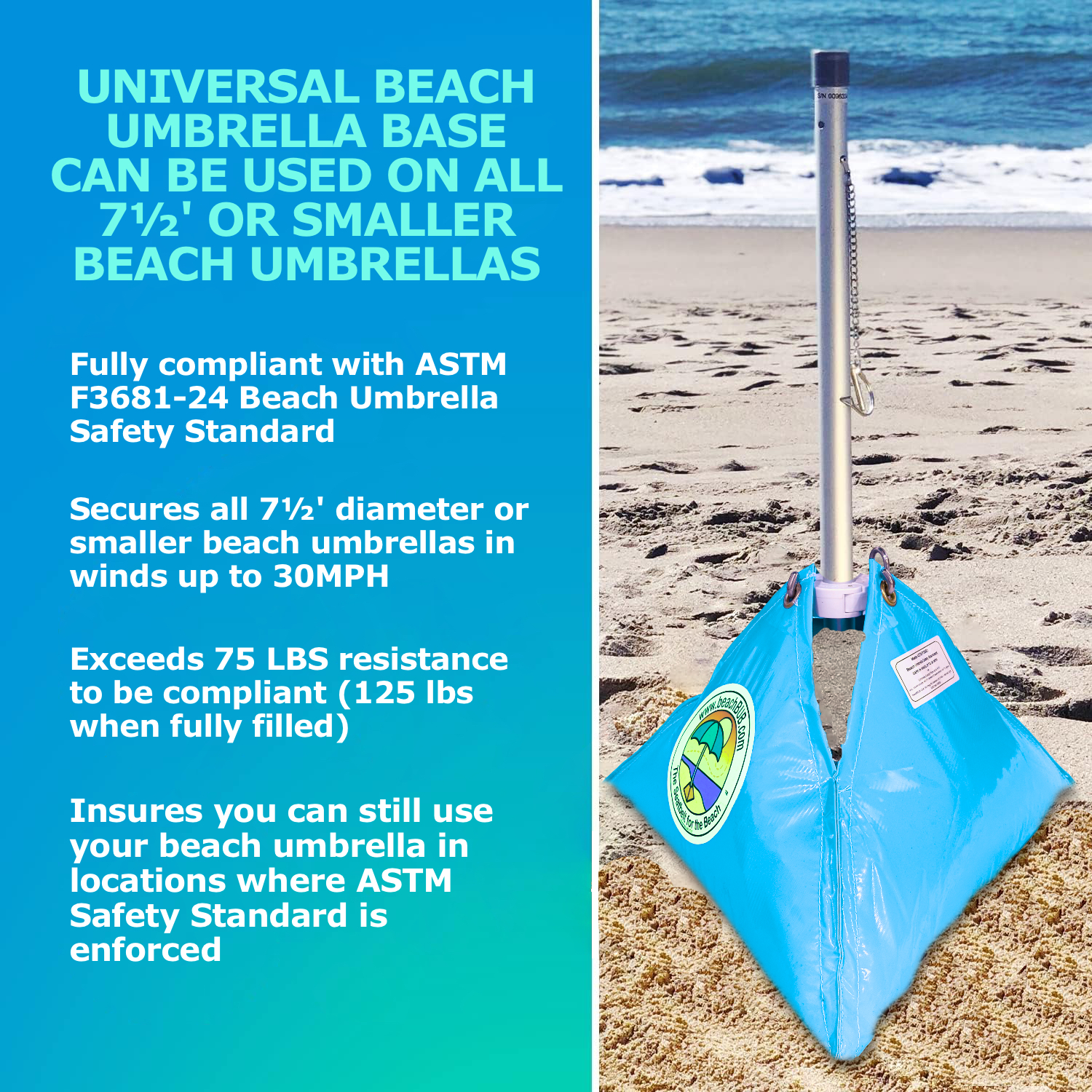 About beachBUB USA: The beachBUB All-In-One Beach Umbrella System is the ultimate companion for enjoying sunny days at the beach without worrying about wind or instability. Engineered and wind tunnel tested to 44 MPH, this innovative beach umbrella system redefines convenience and durability. Gone are the days of struggling with screw-in anchors or digging deep holes. The beachBUB Umbrella System includes the ASTM compliant base which is simply filled with sand to ensure maximum stability without any hassle. To date the beachBUB Umbrella Ultra base is the only device on the market that meets the new ASTM safety standard and includes a label confirming its compliance. In fact, the beachBUB ULTRA base exceeds the new standard by 160% when filled completely, providing users with a built-in margin of safety.