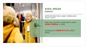 DELAWARE, WILMINGTON, UNITED STATES, April 22, 2024 /EINPresswire.com/ -- According to a new report published by Allied Market Research, titled, "Kids Wear Market," The kids wear market was valued at $194.1 billion in 2022, and is estimated to reach $286.9 billion by 2032, growing at a CAGR of 4.1% from 2023 to 2032.