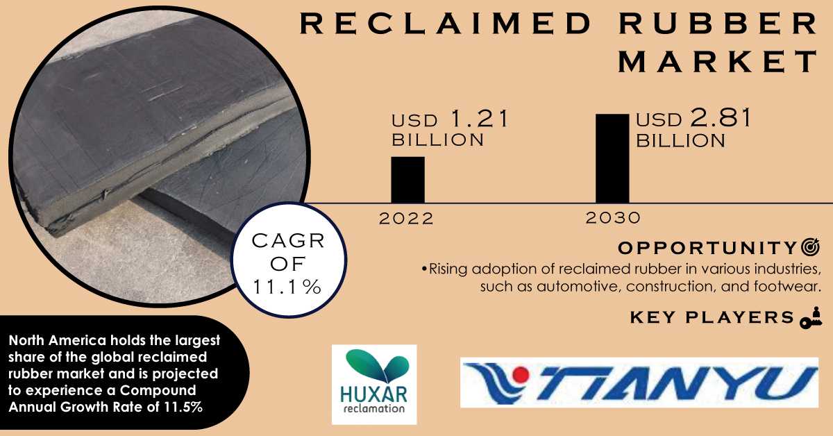 TEXES, AUSTIN, UNITED STATES, April 23, 2024 /EINPresswire.com/ -- Increasing environmental consciousness and demand for sustainable alternatives drive the exponential growth of the Reclaimed Rubber Market.The SNS Insider report reveals that the Reclaimed Rubber Market, valued at USD 1.21 Billion in 2022, is poised to surge to USD 2.81 Billion by 2030, showcasing a robust CAGR of 11.1% during 2023-2030. The reclaimed rubber market is experiencing substantial growth driven by increasing environmental concerns, stringent regulations, and the rising demand for sustainable materials in various industries. Reclaimed rubber, also known as recycled rubber, is derived from discarded rubber products such as tires, conveyor belts, and automotive parts through a process of grinding, shredding, and refining. This eco-friendly alternative to virgin rubber offers comparable performance and properties while reducing the environmental impact of waste disposal and conserving valuable resources. As governments worldwide implement regulations to promote recycling and reduce landfill waste, the demand for reclaimed rubber is expected to continue growing, driving investments in recycling infrastructure and technology by manufacturers.