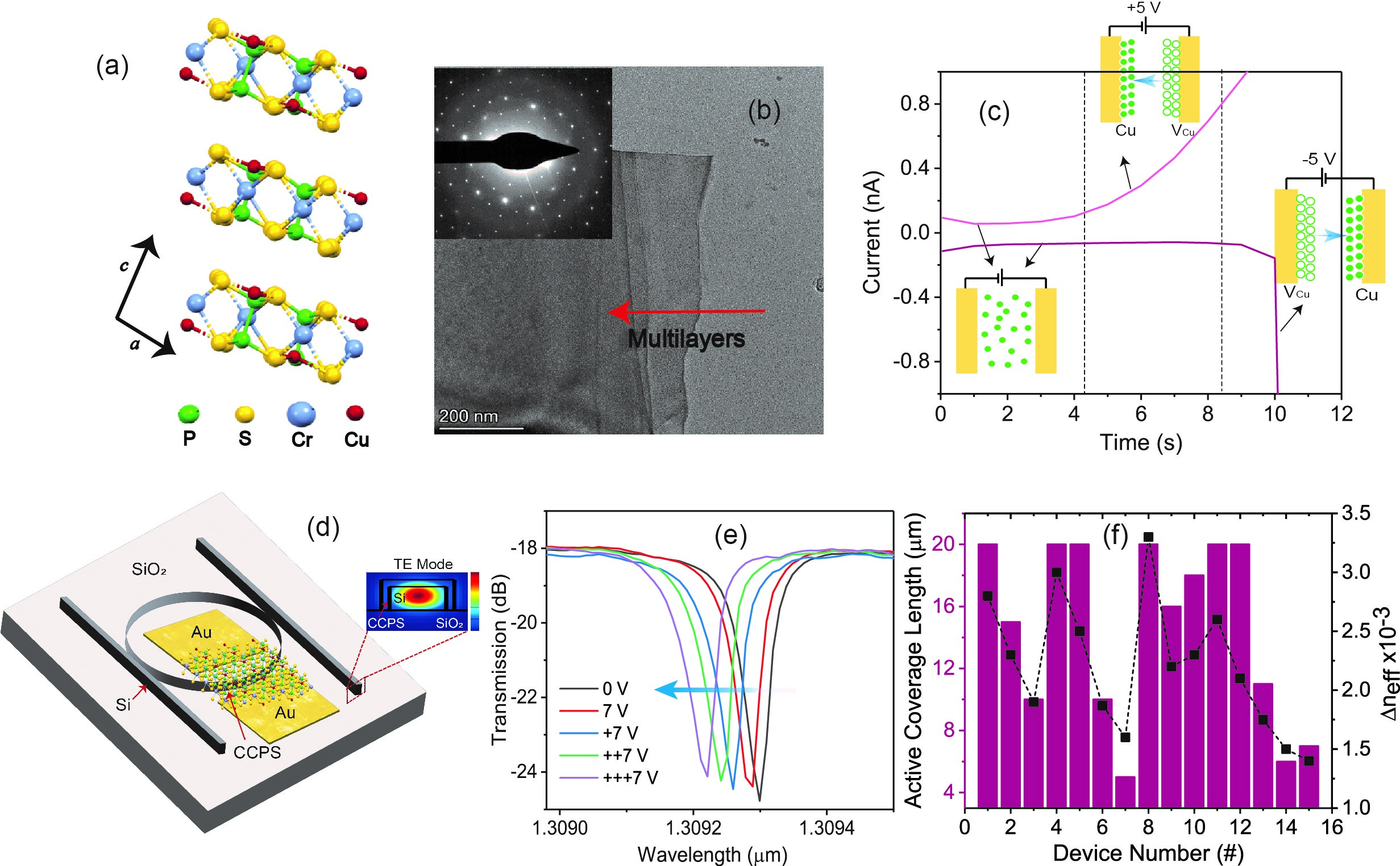 “We have demonstrated a novel approach for actively manipulating light by employing ferroionic 2D CCPS material. Integrated into SiPh microring resonators, these materials showcase an exceptional ability to precisely adjust the effective refractive index without introducing any amplitude chirp. This capability is attributed to the tunable electrical conduction arising from the reversible migration of mobile Cu ions at the metal-semiconductor interface. The flexibility of the Cu–S bond facilitates Cu ion hopping between intralayer and interlayer sites, and even across the van der Waals (vdW) gap under an electric field. Consequently, optical tuning is achieved through the reversible process of extracting Cu ions from sulfur octahedra across van der Waals gaps and their reintercalation into the layers, a process that is reliably controlled by the applied voltage.”