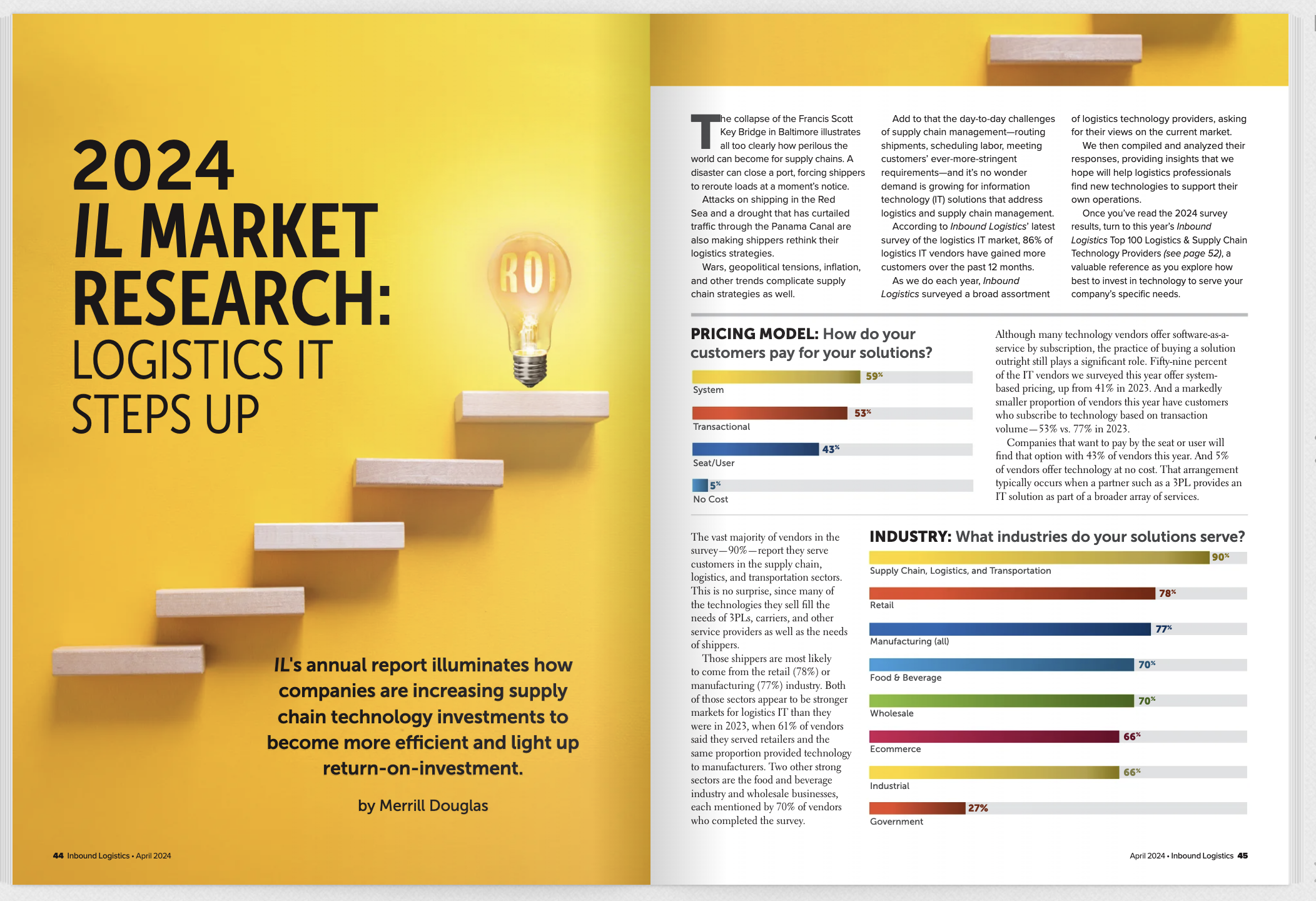The 2024 IT Perspectives Report is featured in all April 2024 editions of Inbound Logistics. For more information and to access the complete report, please visit the Inbound Logistics website or access the digital edition here.