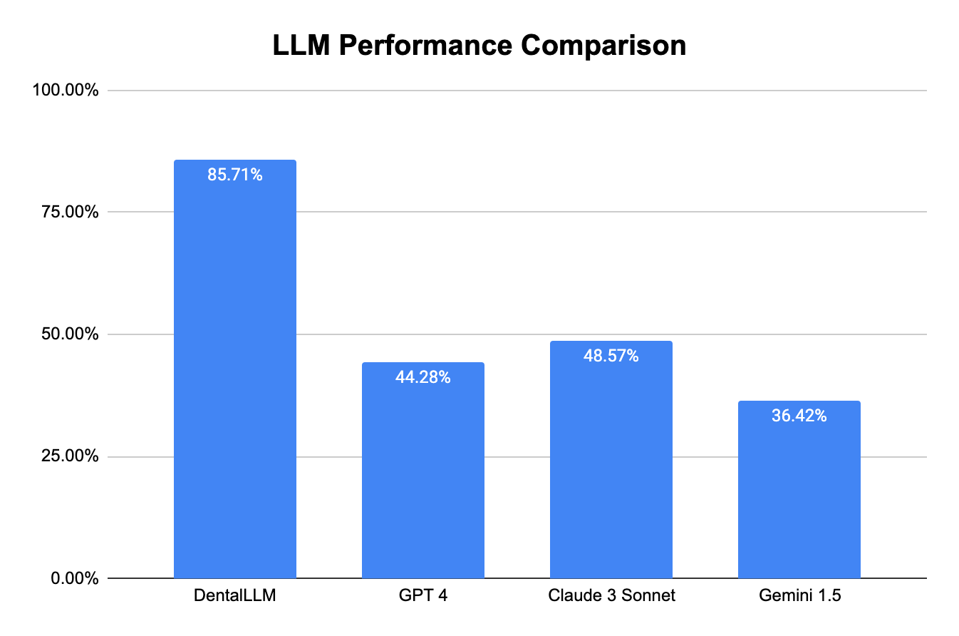 Table 1 compares the answer accuracy among a list of dental trend knowledge questions. The results indicate that with the practice data on the Sikka.ai platform, the Sikka.ai DentalLLM surpasses ChatGPT-4, Gemini 1.0, and Claude 3 Sonnet in answering a list of dental trend knowledge questions.