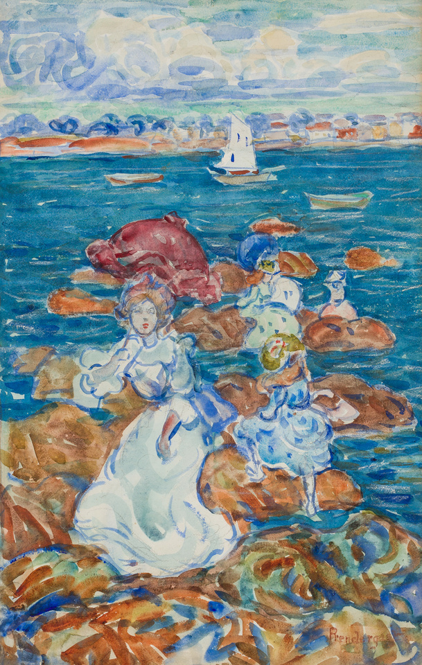 Watercolor and pencil on paper by Maurice Brazil Prendergast (Newfoundland/American, 1858-1924), titled Low Tide (1901), 20 ½ inches by 13 inches. Estimate: $80,000-$120,000.