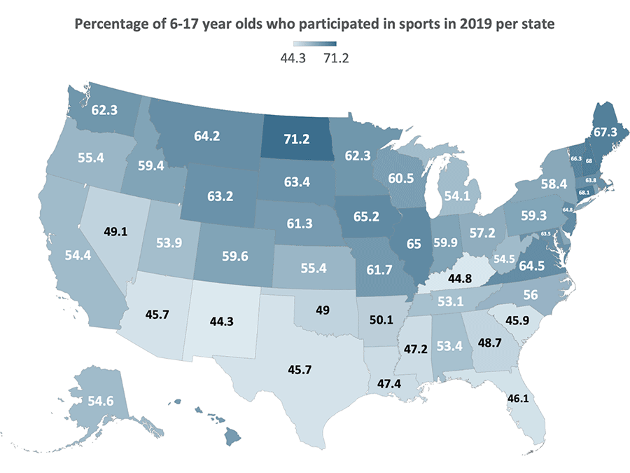 The comparison revealed a notable correlation: states with higher obesity rates often have lower rates of sports participation, and vice versa. According to their analysis, of the 10 states with the smallest percentage of kids who participated in sports, 5 of them—Kentucky, New Mexico, Mississippi, Louisiana, and Texas—also made the list of the 7 worst states for youth obesity. Conversely, of the 10 states with the highest percentage of participation in youth sports, 3 of them—Vermont, Montana, and New Hampshire—made the list of the 11 states with the lowest levels of youth obesity.