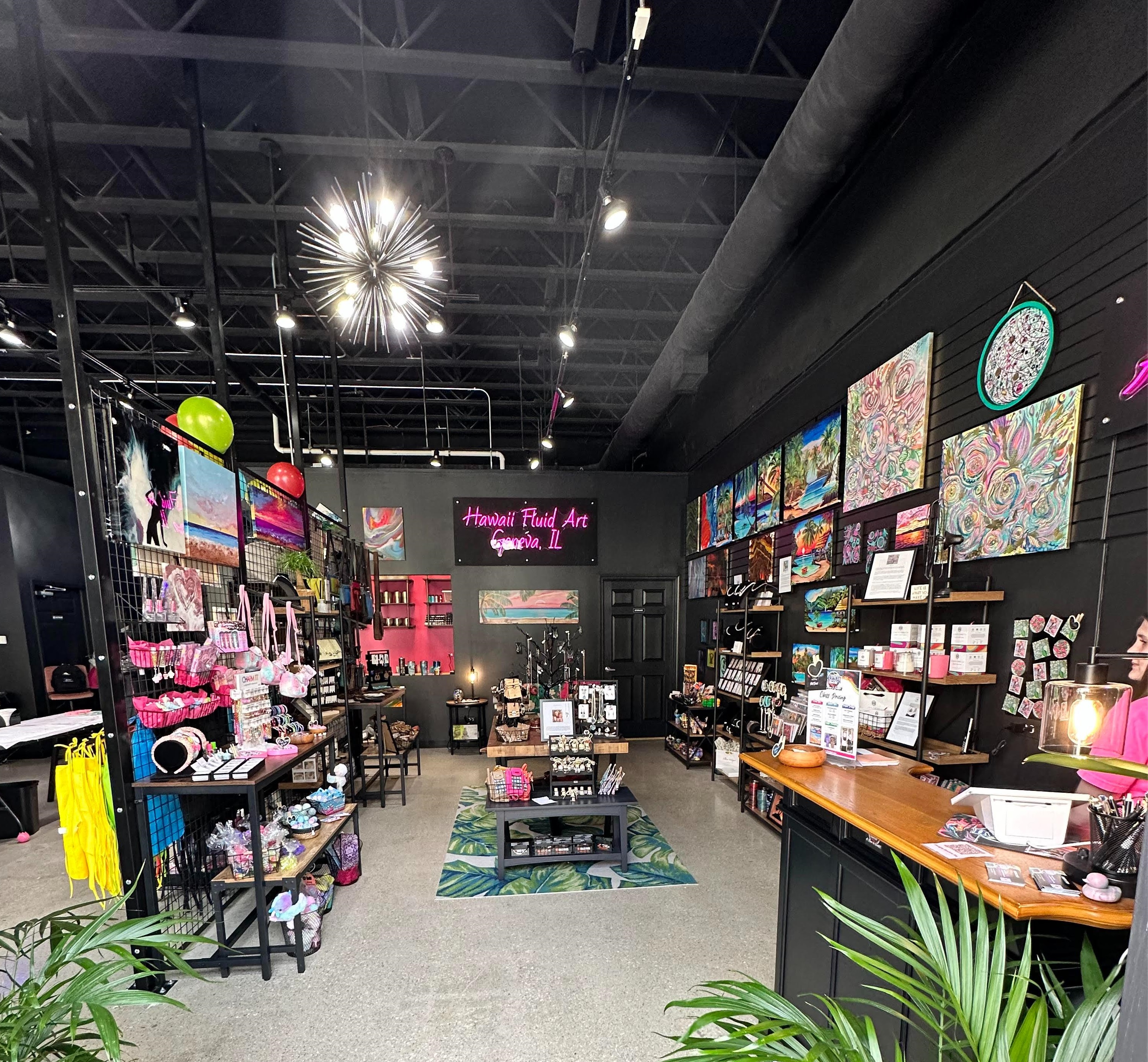 Open seven days a week, Hawaii Fluid Art, Geneva offers art classes, retail shopping, an art gallery and more. The art classes are fun, fast, and easy, and fluid art is the perfect activity for all ages and skill levels. The studio offers classes in acrylic pour painting, resin beach scenes, resin tumblers, glass painting, mosaic resin frames, charcuterie boards and wine glasses.