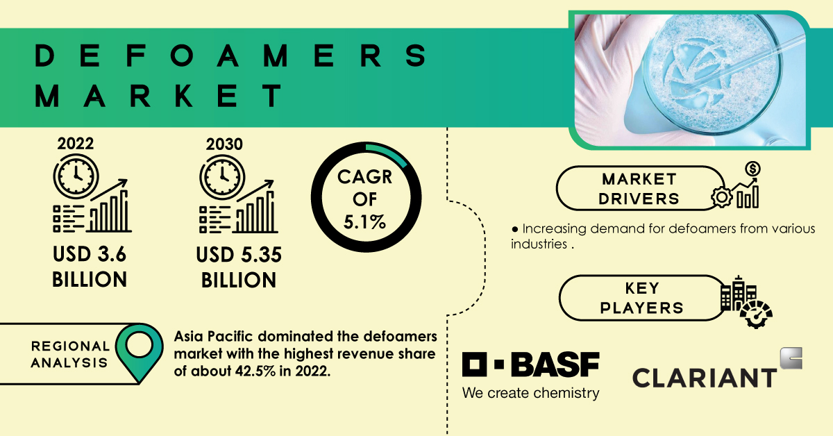 TEXES, AUSTIN, UNITED STATES, April 25, 2024 /EINPresswire.com/ -- The Defoamers Market growth is mainly due to the increasing usage of the product in numerous agrochemicals, including pesticides and fertilizers, and the significant development of the water treatment infrastructure. Driven by the rising demand for technology in the automotive, paints and coatings, and food and beverages industries, the global defoamers market is expected to grow throughout the forecast period.The SNS Insider report indicates that the Defoamers Market size was valued at USD 3.6 billion in 2022. It is expected to grow to USD 5.35 billion by 2030 and grow at a CAGR of 5.1% over the forecast period of 2023-2030. The defoamers market is witnessing substantial growth driven by the increasing demand across various industries where foaming can hinder processes and product quality. Defoamers, also known as anti-foaming agents or foam control agents, are chemical additives that prevent or reduce foam formation during industrial processes such as manufacturing, wastewater treatment, and food processing. With foaming causing inefficiencies, product defects, and safety hazards in numerous applications, the need for effective defoamers is paramount to ensure smooth operations and product quality.