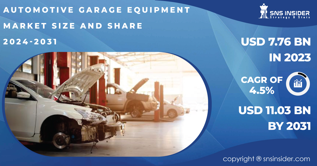 AUSTIN, TEXAS, UNITED STATES, April 25, 2024 /EINPresswire.com/ -- The Automotive Garage Equipment Market is expected to reach a valuation of USD 11.03 billion by 2031 from USD 7.76 Billion in 2023, reflecting a Compound Annual Growth Rate (CAGR) of 4.5% from 2024 to 2031.Market Growth Propelled by Upgradation and Emerging Economies