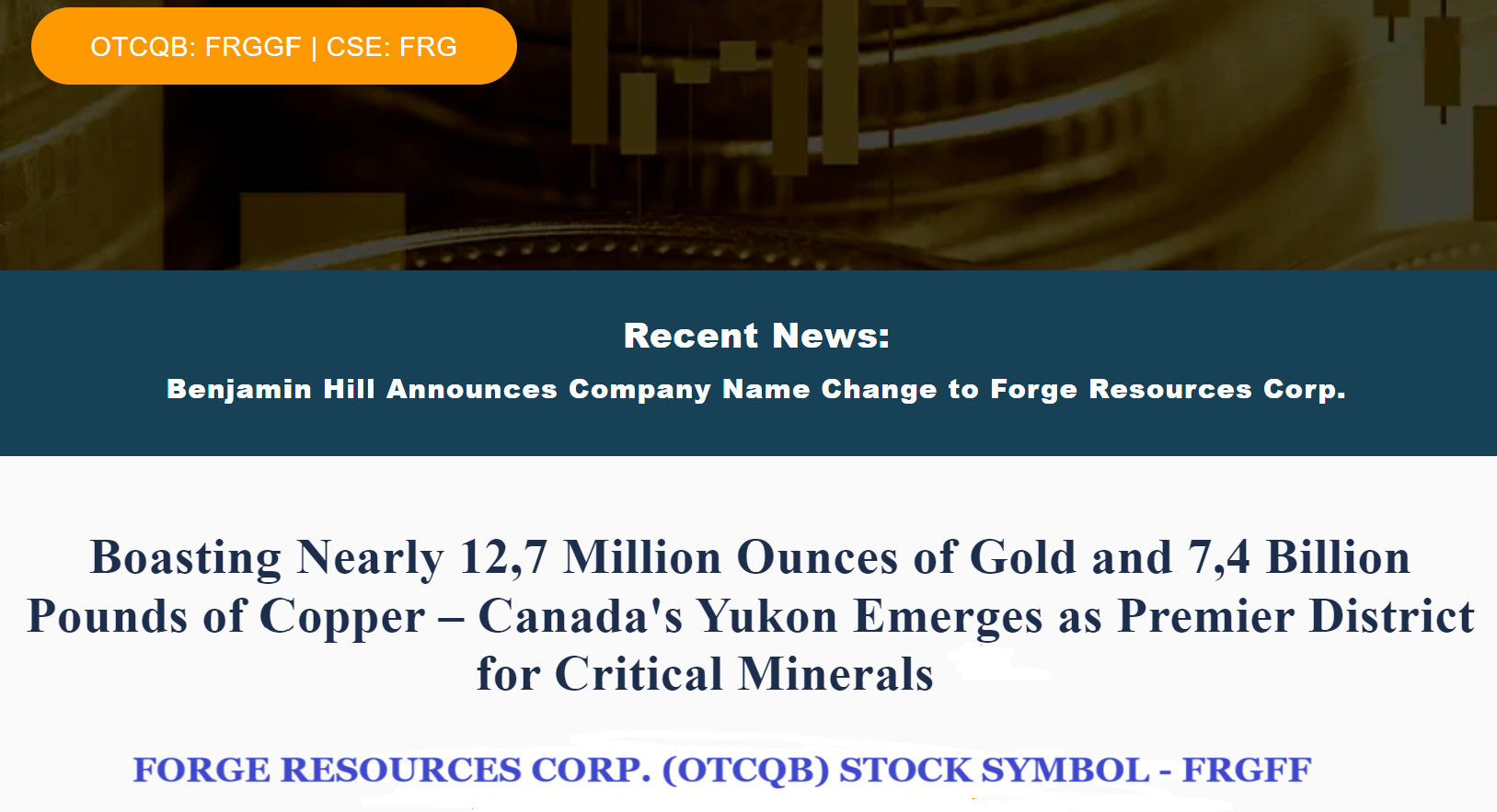 Cole McClay, FRGGF CEO stated: "With great enthusiasm, we unveil our new name: Forge Resources Corp. We have selected Forge Resources as the company title because it embodies our vision, resilience, and commitment to developing high-quality projects."