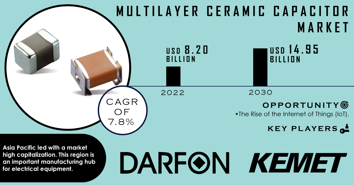 AUSTIN, TEXAS, UNITED STATES, April 26, 2024 /EINPresswire.com/ -- Market Size & Report ScopeThe Multilayer Ceramic Capacitor (MLCC) Market size, which stood at USD 8.20 billion in 2022, is projected to grow to USD 14.95 billion by 2030, achieving a CAGR of 7.8% from 2023 to 2030.
