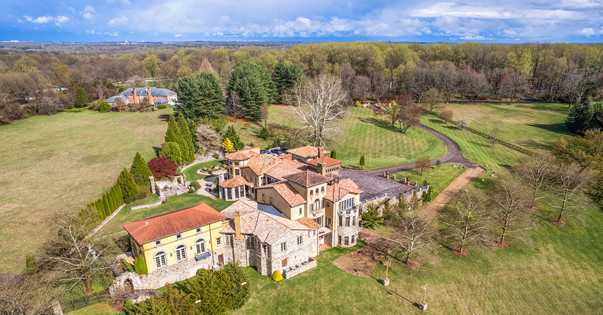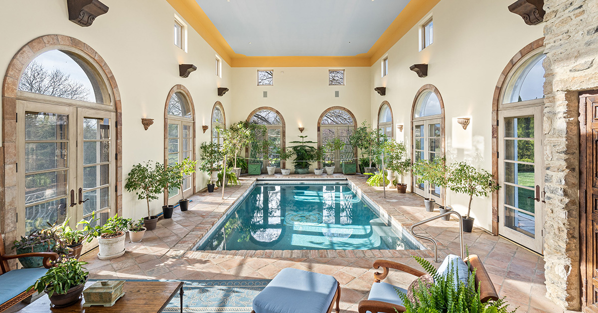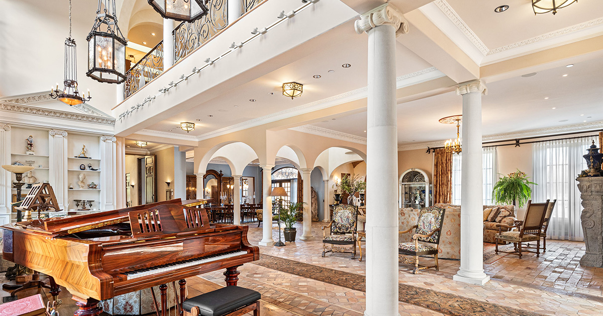 Additional highlights include a two-story family room with an antique armoire and wood stove, a library with custom bookshelves and a 17th-century Italian mantle, and a primary suite featuring a hand-forged chandelier and marble fireplace. The estate also features an executive office suite, a temple room leading to an enclosed swimming pool and Turkish bath, and a vault ideal for storage.