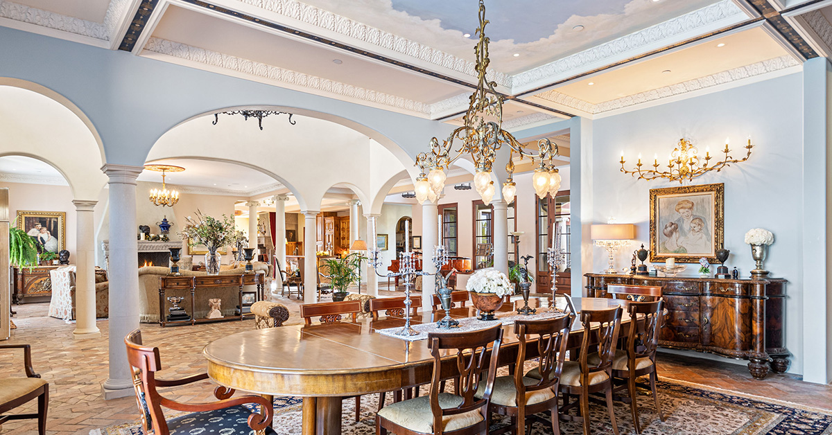 To the right of the foyer, the dining room showcases a coffered ceiling painted with celestial motifs, flanked by exterior doors inspired by Italian monasteries. Adorning the room are three black walnut doors crafted from aged planks and antique medallions, alongside an antique buffet. On the left, the living room features a wood-burning fireplace framed by a 500-year-old pepperino mantle and was designed to accommodate musical recitals, with a grand music space housing an eight-foot grand piano. Antique Italian chandeliers illuminate the space, crafted with Murano glass.