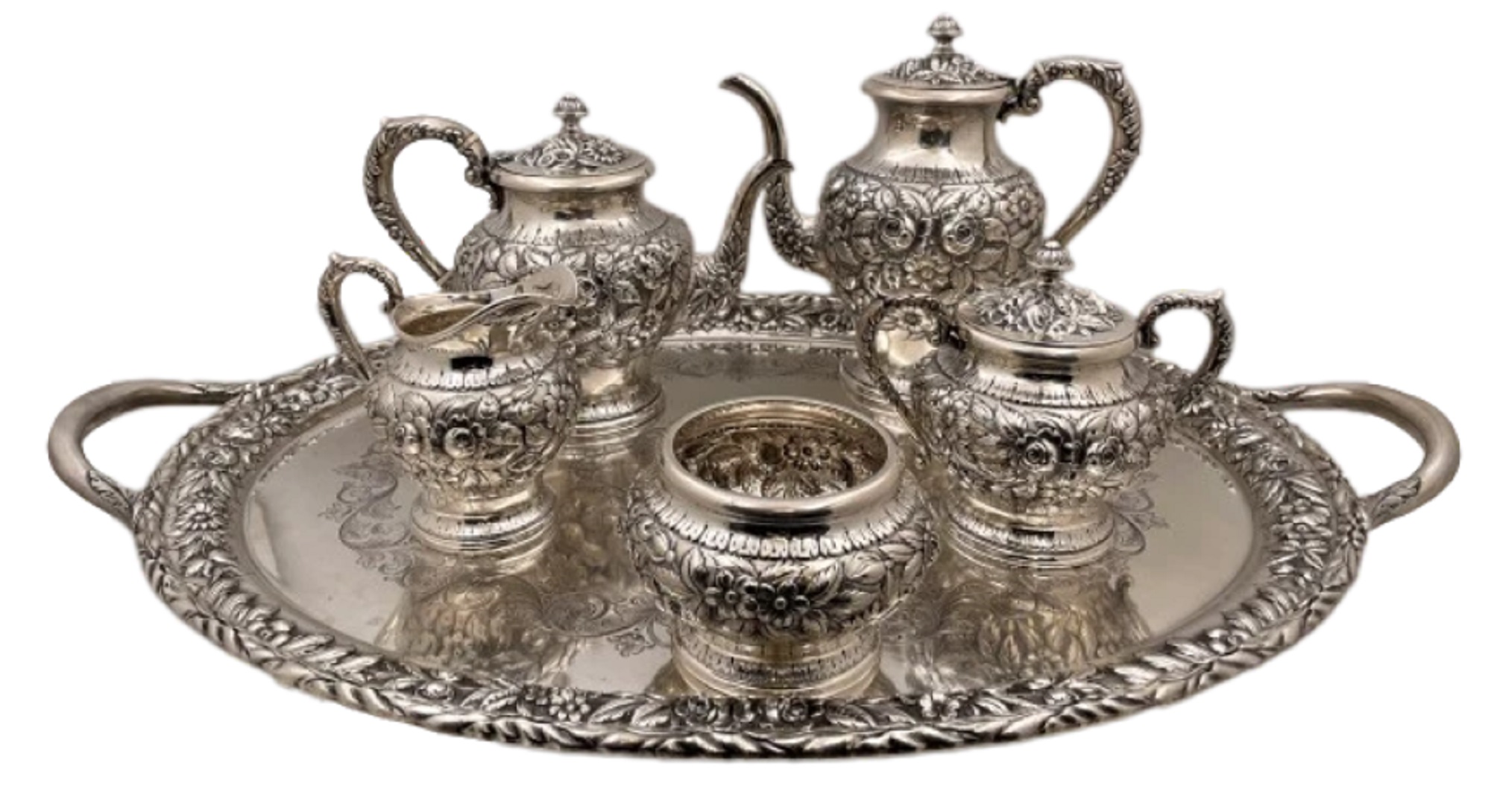 S. Kirk & Son sterling silver repousse six-piece tea and coffee set with tray, all matching and richly adorned with crisp floral motifs, in pattern #474F from 1932 (est. $9,000-$12,000).