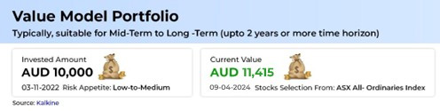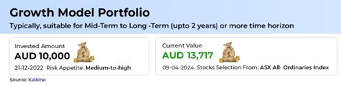 * Kalkine Growth Portfolio yielded a return of 17.62%, exceeding the benchmark index by 11.74%.