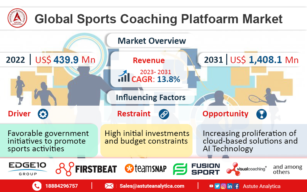 CHICAGO , UNITED STATES, April 29, 2024 /EINPresswire.com/ -- The global 𝐬𝐩𝐨𝐫𝐭𝐬 𝐜𝐨𝐚𝐜𝐡𝐢𝐧𝐠 𝐩𝐥𝐚𝐭𝐟𝐨𝐫𝐦𝐬 𝐦𝐚𝐫𝐤𝐞𝐭 is poised for significant growth, with projections indicating a substantial rise in revenue from 𝐔𝐒$ 𝟒𝟑𝟗.𝟗 𝐦𝐢𝐥𝐥𝐢𝐨𝐧 𝐢𝐧 𝟐𝟎𝟐𝟐 to an estimated 𝐔𝐒$ 𝟏,𝟒𝟎𝟖.𝟏 𝐦𝐢𝐥𝐥𝐢𝐨𝐧 𝐛𝐲 𝟐𝟎𝟑𝟏. This surge represents a remarkable compound annual growth rate (𝐂𝐀𝐆𝐑) 𝐨𝐟 𝟏𝟑.𝟖% during the forecast period spanning from 𝟐𝟎𝟐𝟑 𝐭𝐨 𝟐𝟎𝟑𝟏.