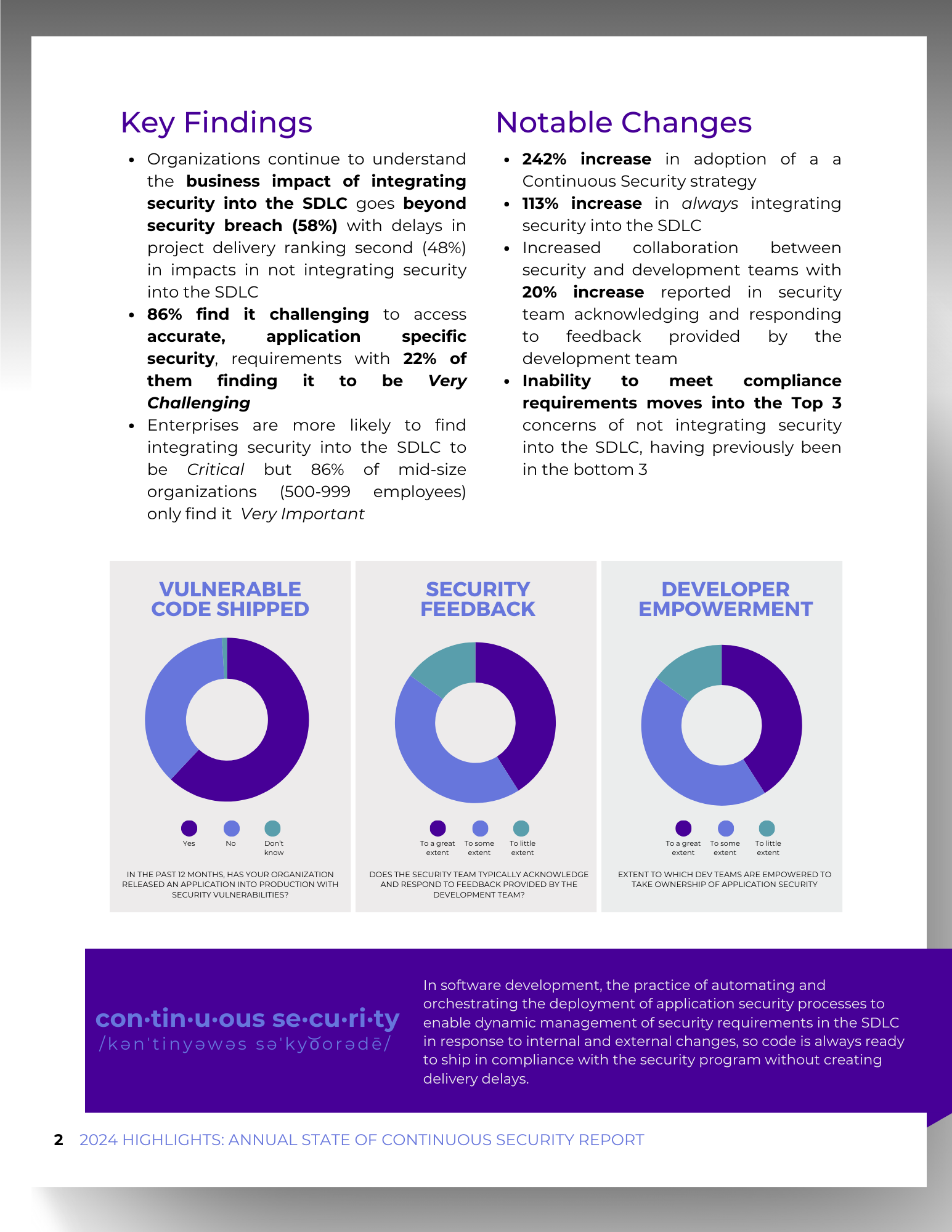 Greenfield added that, "By embracing continuous security practices and eliminating bottlenecks, organizations can not only enhance their security posture but also optimize their development processes, shorten time to market, and drive overall business agility. We're encouraged by the progress that organizations are making in integrating security into the SDLC, however, the results of our report also show that there are still some challenges that need to be addressed.”