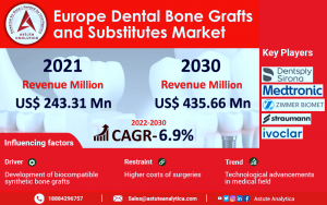 CHICAGO , UNITED STATES, April 30, 2024 /EINPresswire.com/ -- The 𝐄𝐮𝐫𝐨𝐩𝐞𝐚𝐧 𝐃𝐞𝐧𝐭𝐚𝐥 𝐁𝐨𝐧𝐞 𝐆𝐫𝐚𝐟𝐭 𝐚𝐧𝐝 𝐒𝐮𝐛𝐬𝐭𝐢𝐭𝐮𝐭𝐞𝐬 𝐌𝐚𝐫𝐤𝐞𝐭 is projected to witness significant expansion, reaching a value of 𝐔𝐒$ 𝟒𝟑𝟓.𝟔𝟔 𝐌𝐧 𝐛𝐲 𝟐𝟎𝟑𝟎. According to extensive analysis, the market is anticipated to experience a compound annual growth rate (𝐂𝐀𝐆𝐑) 𝐨𝐟 𝟔.𝟗% during the forecast period spanning from 𝟐𝟎𝟐𝟐 𝐭𝐨 𝟐𝟎𝟑𝟎. This growth trajectory indicates a remarkable 55% increase compared to its 𝟐𝟎𝟐𝟏 𝐯𝐚𝐥𝐮𝐞 𝐨𝐟 𝐔𝐒$ 𝟐𝟒𝟑.𝟑𝟏 𝐌𝐧.