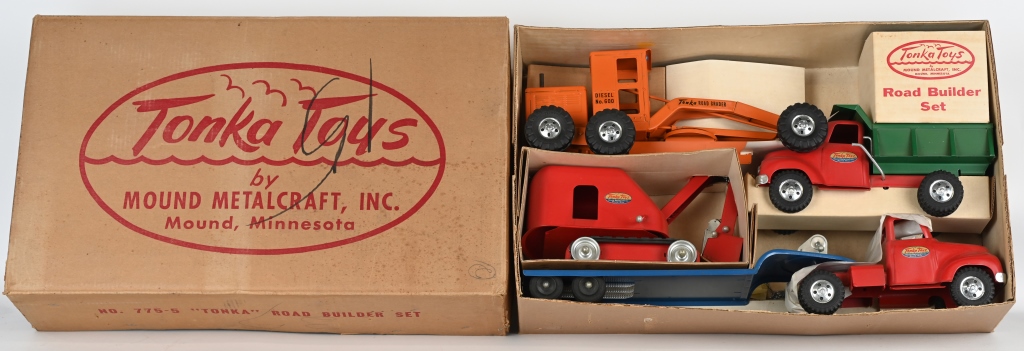 1955 Tonka pressed steel #775-5 Road Builder Set including semi with lowboy trailer, steam shovel, road grader and dump truck in original correctly partitioned box. Estimate: $1,500-$2,000