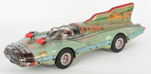 Large and wildly futuristic Yonezawa (Japan) tin friction #58 Atom Jet racer with driver inside clockwork. Beautiful colors, graphics and details. Both friction and motor sound are functional. Length: 26in. Estimate: $10,000-$15,000