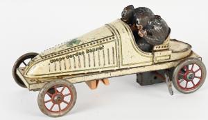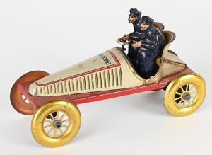 Rare Gunthermann (Germany) tin clockwork Gordon Bennet racer with original passenger figures. Length: 8½in. Estimate: $6,000-$8,000