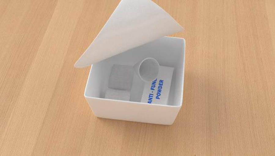 The funnel poop guard with the small foam insert can be placed near the sacrum wound, covered with the gauze and anti-fungal cream. The wound dressing is applied according to medical recommendations. The funnel poop guard with the foam insert is covered with gauze tape. The anus is covered with a 4x4 gauze with anti-fungal cream and powder to also preserve the integrity of that area of the skin. Patients can expel fecal matter without worrying of waste touching and infecting the wound. Caregivers can wipe away fecal matter without interrupting the scheduled wound dressing change. The wound is left clean and untouched for optimal healing. The kit is designed to promote faster and more effective healing, protecting the skin around the anal area and offers an alternative to having a colostomy procedure.
