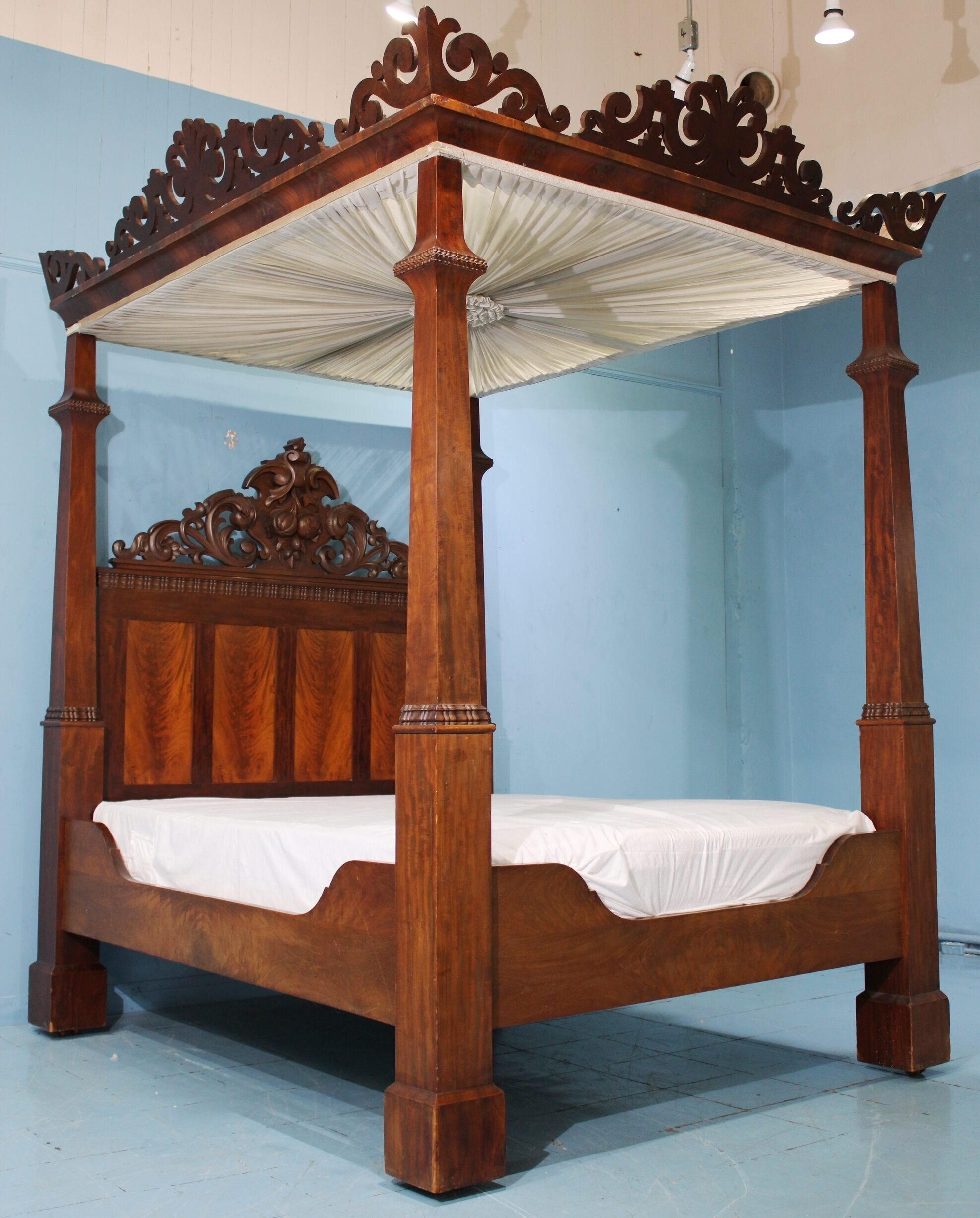 A four-piece solid mahogany bedroom suite consisting of a full-size high-back bed with carved headboard, a dresser, washstand and chest is expected to bring $3,500-$4,500; while a mahogany plantation full tester bed with a carved headboard and pierce carved gallery around the top, 103 inches tall by 71 ½ inches long by 63 inches wide, carries a pre-sale estimate of $4,000-$8,000.
