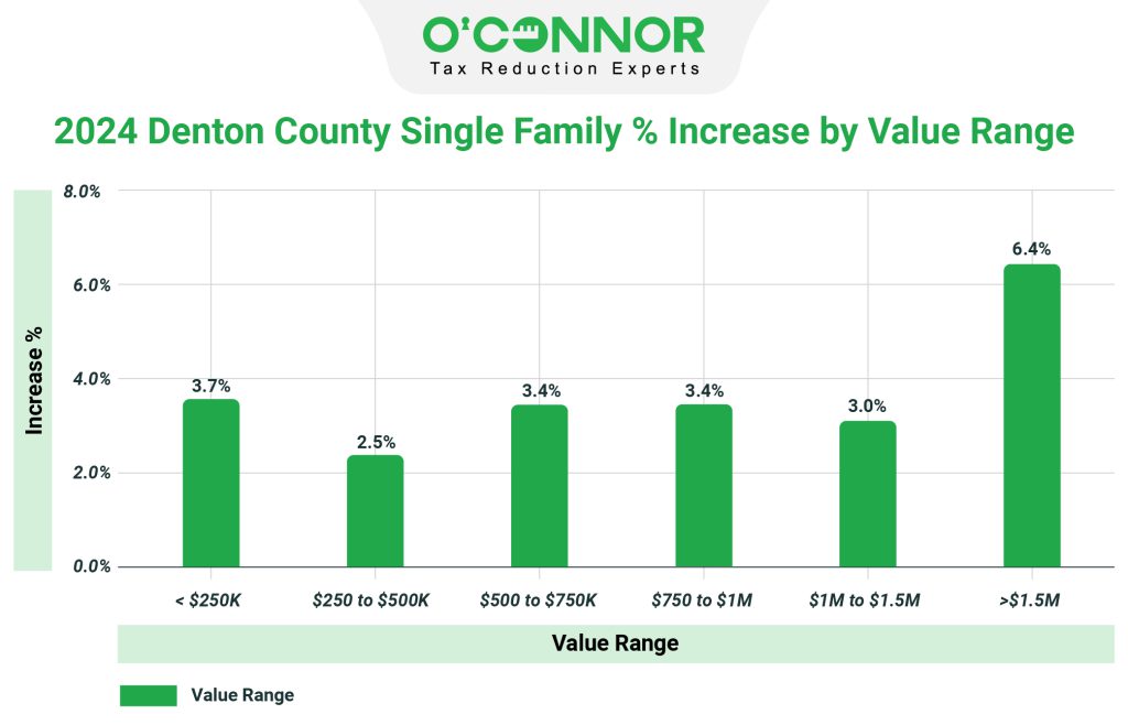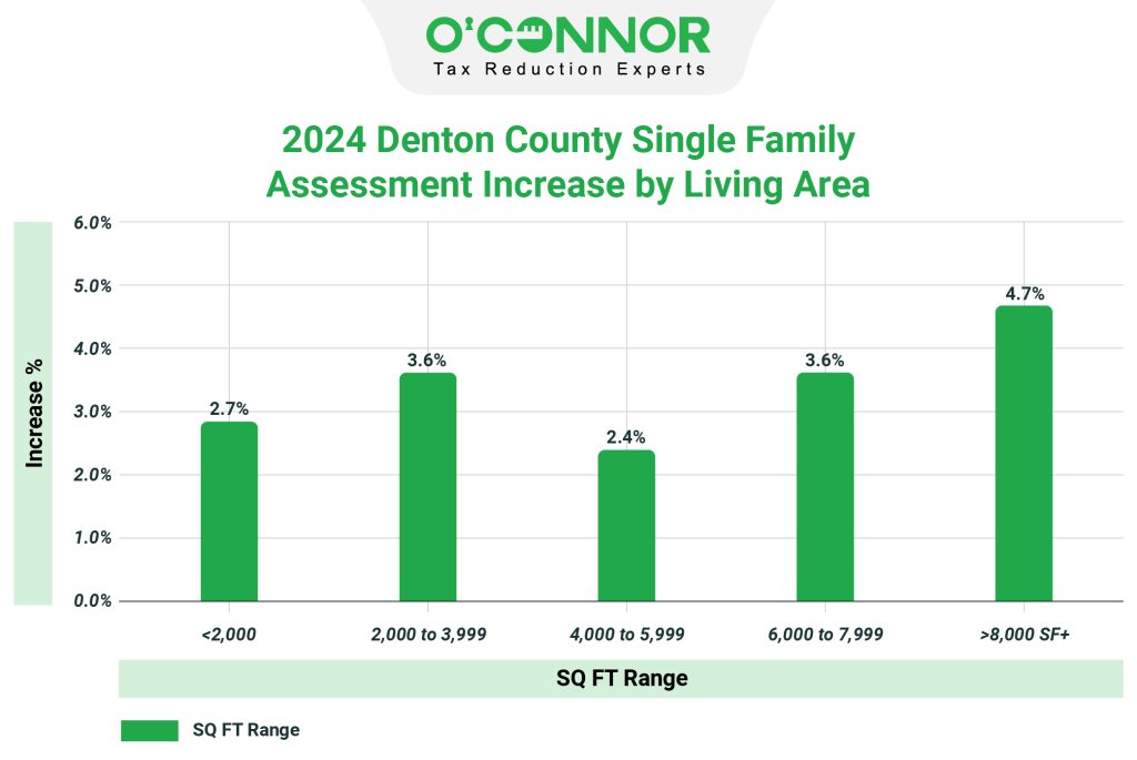 Property tax assessment increases in Denton County in 2024 were roughly the same regardless of home size, although homes over 8,000 SF did have the largest level of upturn.