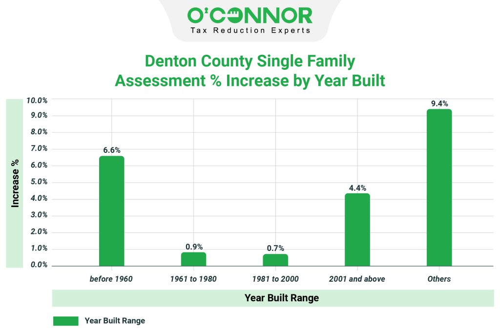 Increases of 20 to 34% were given to all vintages of commercial real estate in Denton County. There does not appear to be a clear reason that increases are higher for some categories. However, in a tough market there is a move to quality and the higher increases for newer buildings may reflecting that trend.