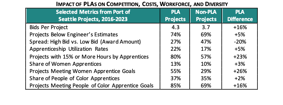 LA GRANGE, IL, USA, May 7, 2024 /EINPresswire.com/ -- A first-of-its-kind analysis of construction projects from the Port of Seattle between 2016 and 2023—including airports and seaports—shows that project labor agreements (PLAs) promote competition amongst contractors, control construction costs, and deliver superior workforce development outcomes over projects completed without PLAs. The report was conducted by researchers at the Illinois Economic Policy Institute (ILEPI) and the Project for Middle Class Renewal (PMCR) at the University of Illinois at Urbana-Champaign.Read the Report, “The Impact of Project Labor Agreements on Competition, Costs, Apprenticeships, and Diversity: Evidence from Port of Seattle Projects.”