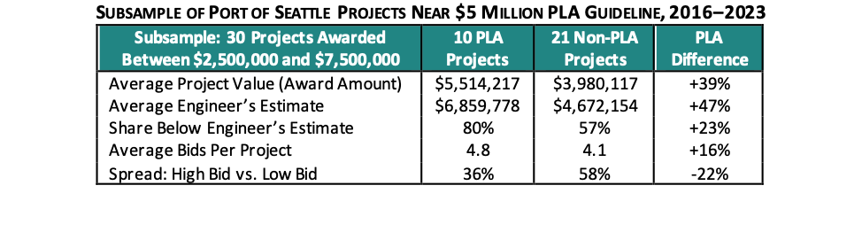“The subsample offers an apples-to-apples comparison of PLA and non-PLA projects and illustrates that PLAs neither undermine bid competition nor inflate costs,” added Manzo. “Indeed, because engineers estimated that the PLA projects would be 47% larger, it is especially striking that the average award came in at 39% more than the non-PLA average. This suggests that PLAs can deliver significant cost efficiencies as a construction management tool.”