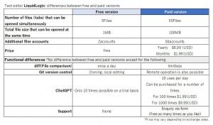 Paid version: 50 files can be opened in the editor, total file size 100MB, up to 50 additional filer accounts each. Unlimited functionality.
