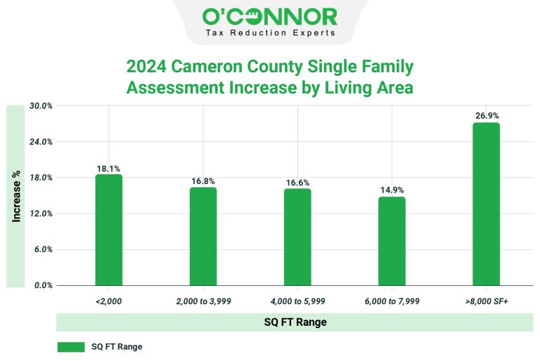 In Cameron County, gains in property value were fairly consistent, irrespective of the size of the residence. Although properties with larger square footage experienced a more pronounced escalation in property tax assessment, particularly those surpassing 8,000 square feet, which went up by 26.9%. For homes measuring less than 2,000 square feet, the property tax assessment increase with the second-largest percentage increase is approximately 18%.