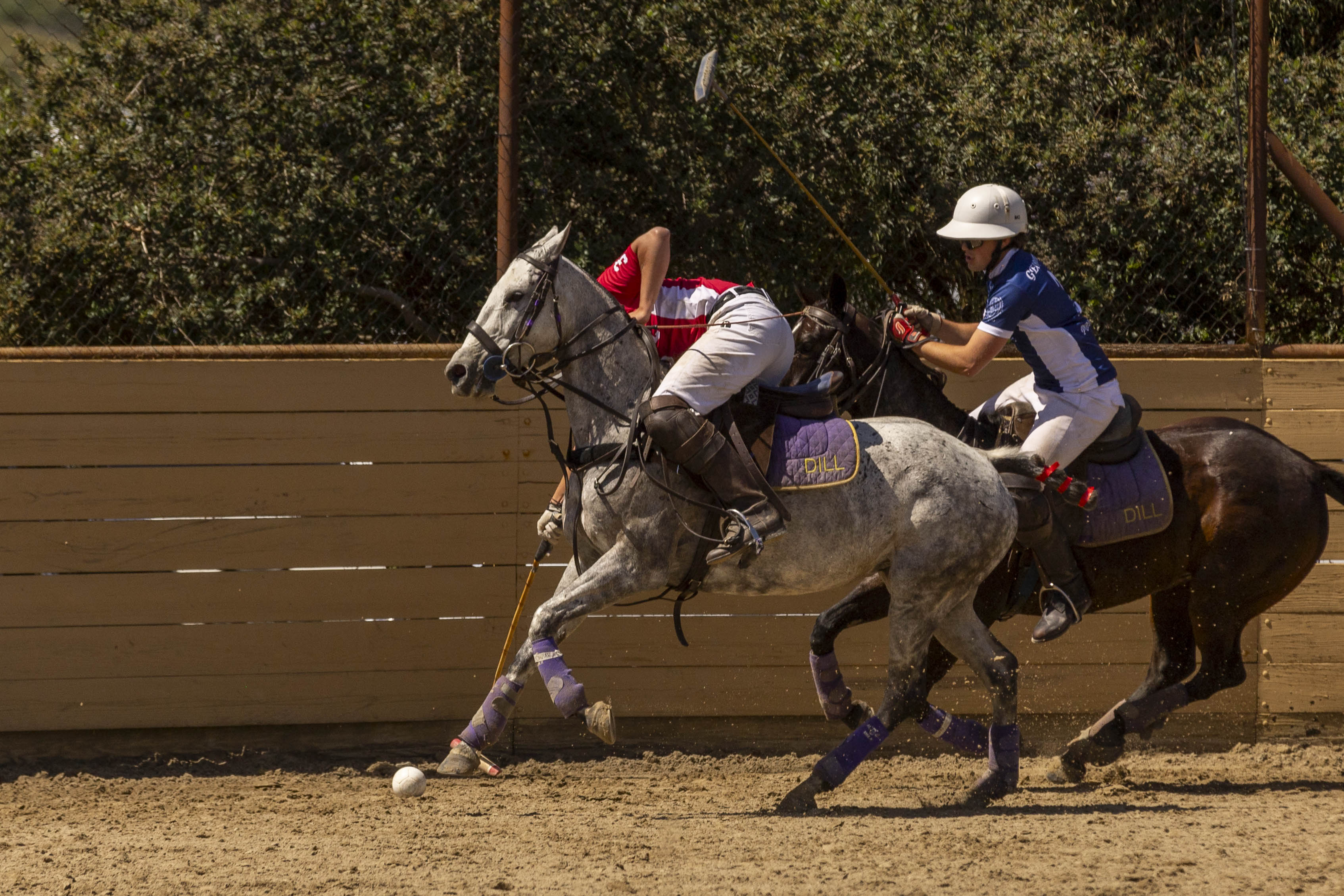 Arena polo, sometimes referred to as hockey on horseback, is a ball and mallet sport played on horseback. Arena polo is played in an enclosed arena with two goal mouths set into either end of the 300 by 150-foot dirt or sand arena. The game is played with teams of three players all mounted on horseback. All players are equipped with bamboo cane mallets and attempt to move the ball into their respective goals to rack up points. Periods of play last for 7.5 minutes and are known as “chukkers” or “chukkas”. At the end of a game, consisting of four chukkers, the team that has the highest number of goals wins. Teams must abide by all rules to ensure the safety of players and horses. With highly trained, athletic horses as the most important teammates, the action is fast and reaction times are quick. The arena aspect brings the action up close to spectators who can feel the thunder of hooves and hear the players communicate with their teammates.