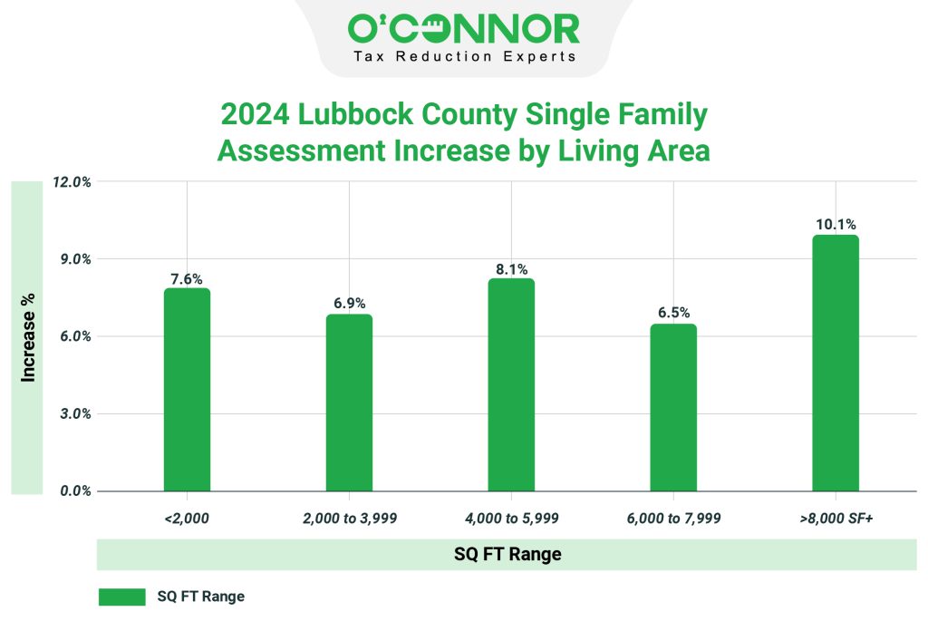 The total value of all properties, irrespective of their size, rose from $21 million to $22 million, representing a 7.3% rise in 2024. Higher-value properties, namely those with an area of more than 8,000 sq ft, had a significant gain of 10%. The rise in property value for single-family homes in Lubbock County remained steady across all sizes of homes.