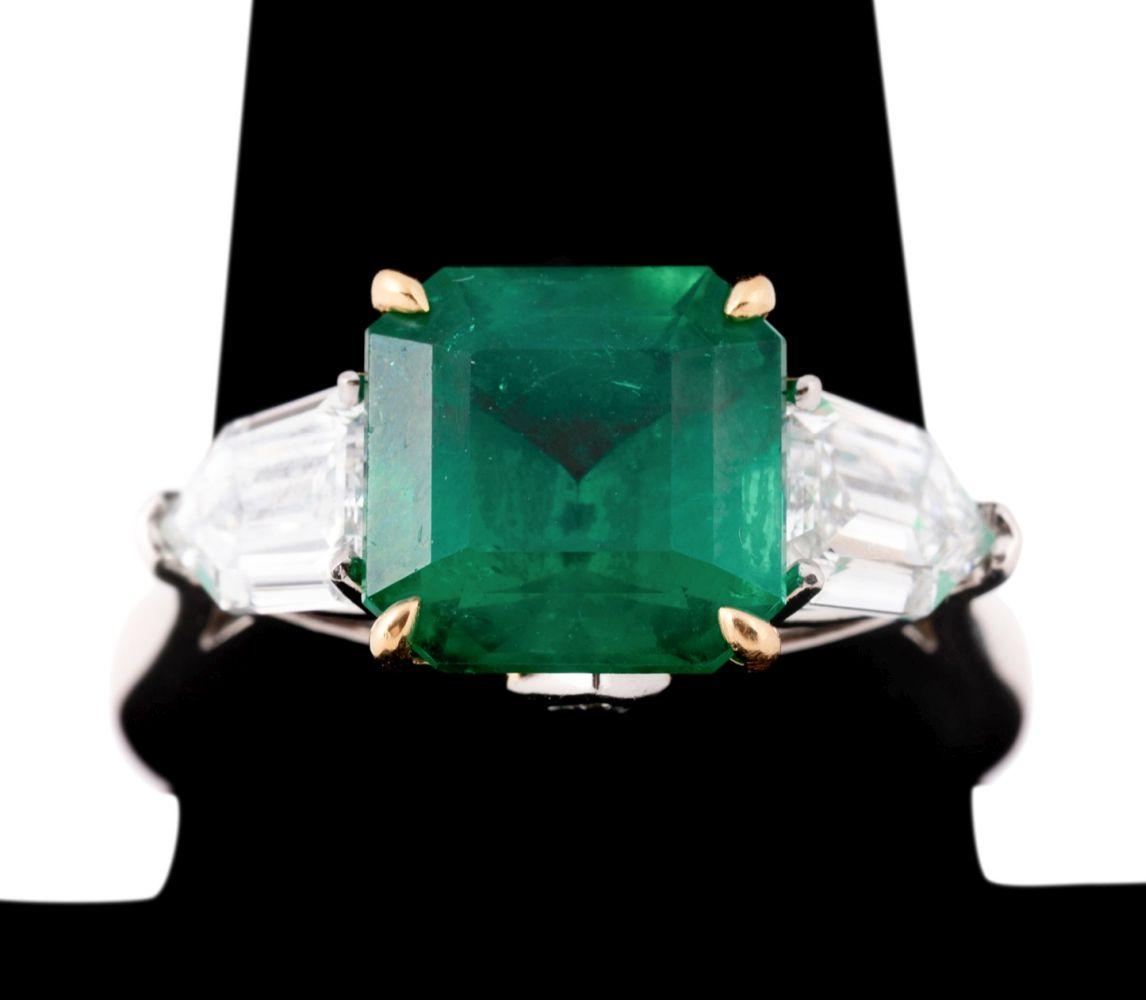 Richard Krementz. emerald and diamond ring in platinum and 18k yellow gold, with a square shaped green emerald weighing 4.44 total carats, set in between accent diamonds ($30,250).