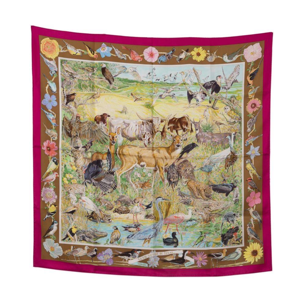 A Kermit Oliver (American/Texas b. 1943), for Hermes 2015 'La Vie Sauvage du Texas' silk scarf, 35 inches square, depicting the wildlife of Texas, with a rose pink border of birds, marked with the title in the design at the lower center, in the original Hermes box with tissue paper, fetched $3,932.