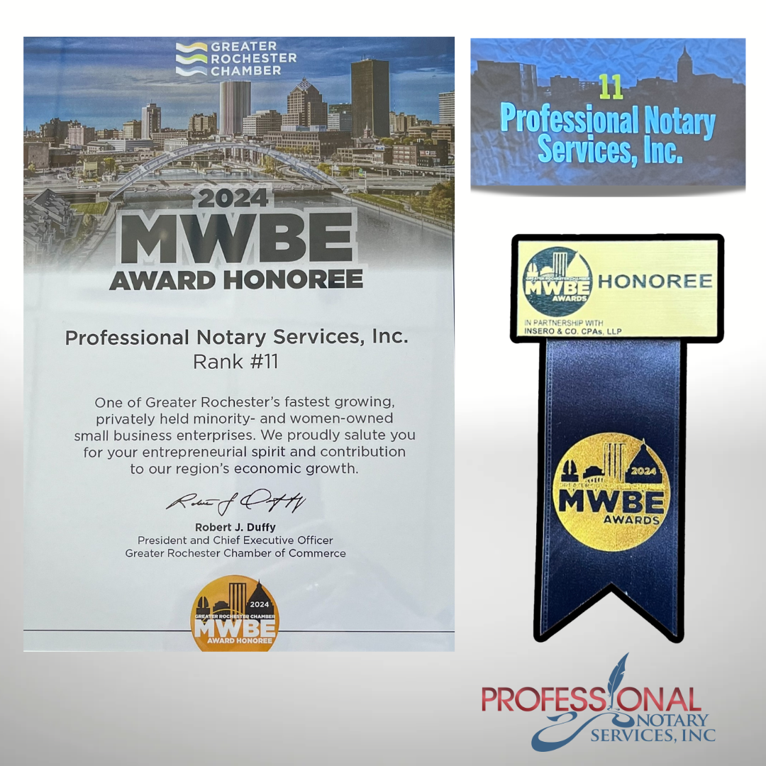 ROCHESTER, NY, UNITED STATES, May 9, 2024 /EINPresswire.com/ -- Professional Notary Services, Inc, a Signing Company owned by Marcy Tiberio, ranked #11 on the list of Top 50 Fastest Growing Small Minority and Women Owned Businesses in the Greater Rochester area. The Greater Rochester Chamber of Commerce accounting partner Insero & Co. CPAs, LLP determines MWBE Award rankings based upon dollar and percentage revenue growth over a three-year period. The rankings were revealed at an awards ceremony held on May 2, 2024, in Rochester, NY.To be eligible for the Greater Rochester Chamber MWBE Awards, businesses must be independent, privately held, headquartered in the Greater Rochester/Finger Lakes region, have a revenue between $100,000 and $20,000,000 in each of the three most recent fiscal years, and have a minimum of 51% ownership, operation, and control by minorities and/or women. The Top 50 MWBEs, ranked by growth percentage, collectively generated $130 million in local revenues. Professional Notary Services is proud to have contributed to the Greater Rochester economy with 1100 notary subcontractors that provide a variety of in-person and remote online document signing services. Women make up the majority of the notary force that works for Professional Notary Services demonstrating PNS's commitment to supporting other women-owned small businesses.